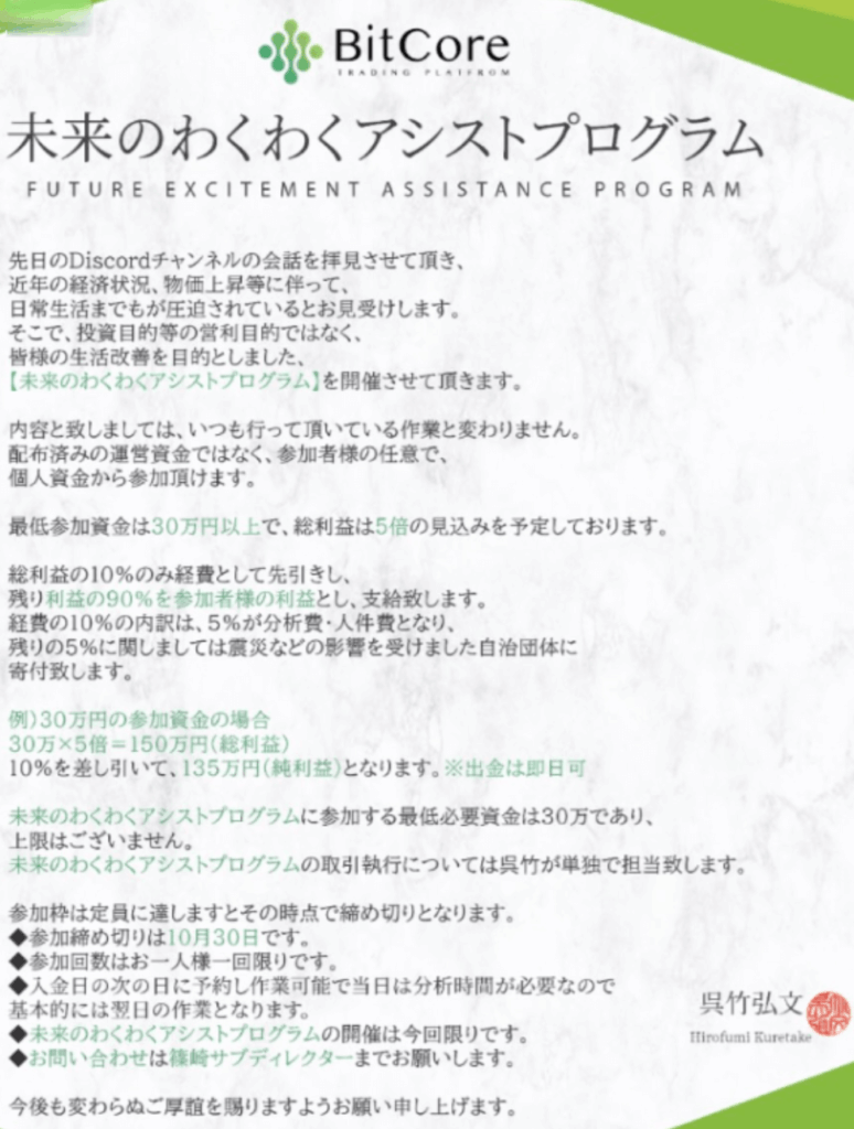 BitCoreの未来のわくわくアシストプログラムの被害については今も調査中です。