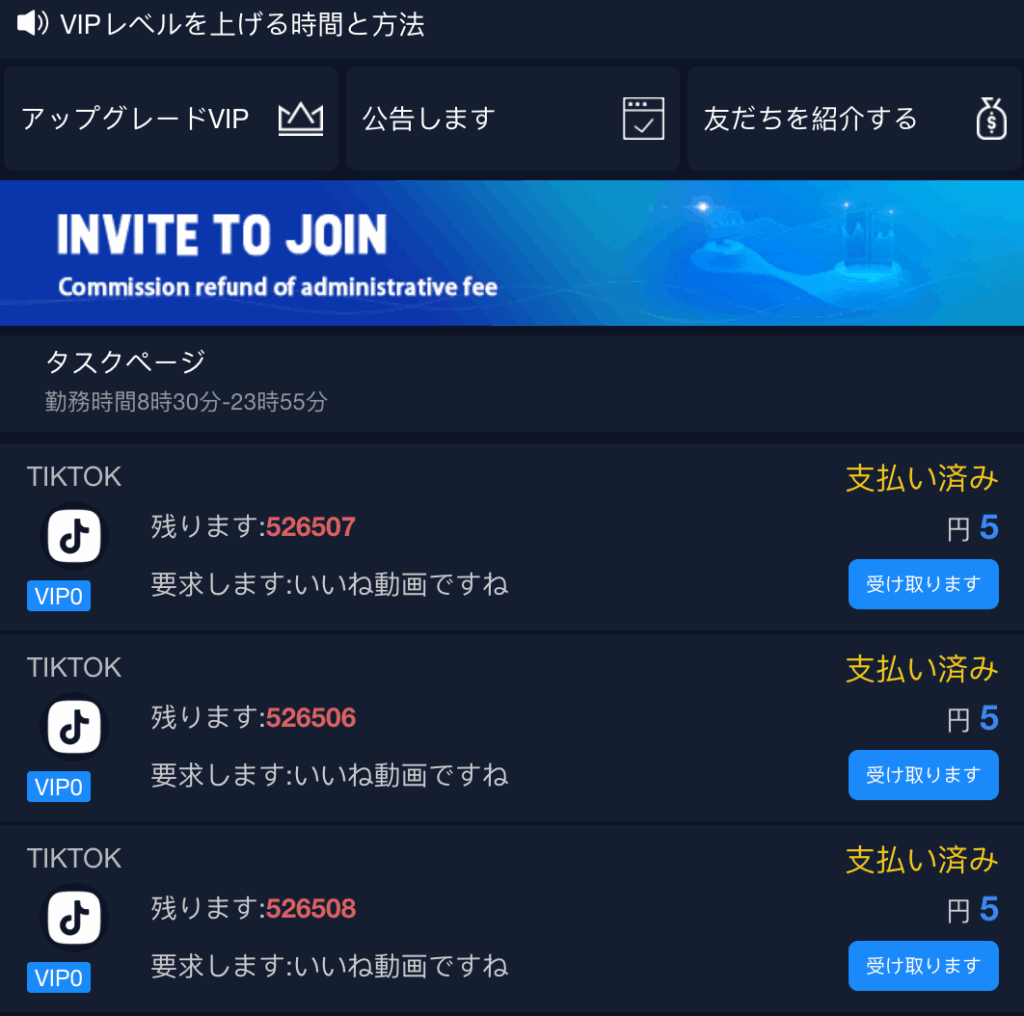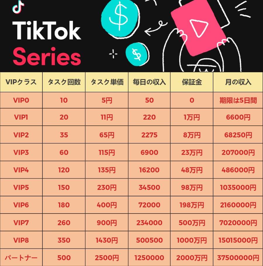 この件でのTikTokSeriesは、このようなVIPクラスとタスクが用意されていて、VIPレベルに応じて報酬が得られるといったものになります。