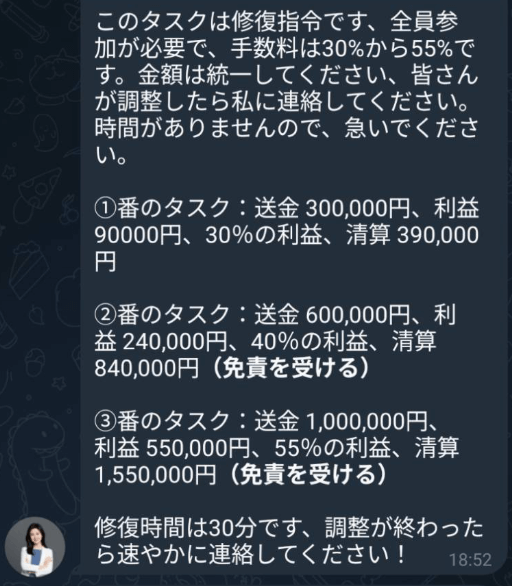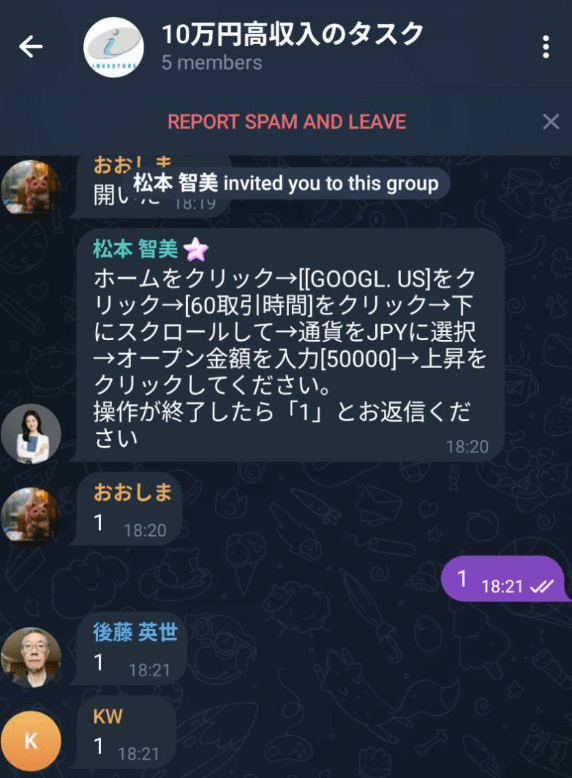 最初にLINEで誘導してくる人物と、テレグラム上の人物はまた別の人間です。