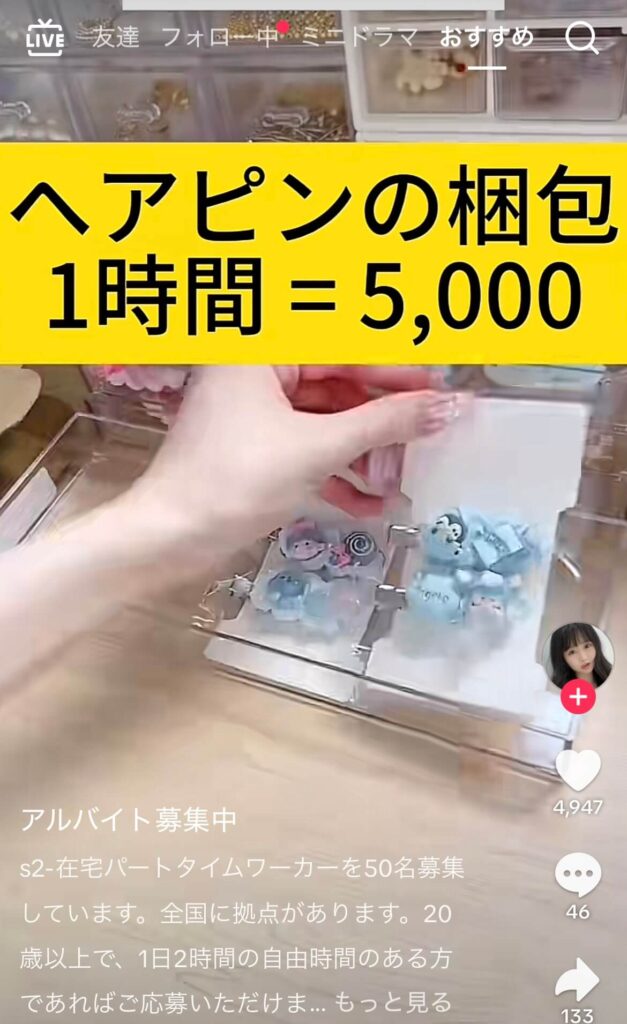 上記は、実際にTikTokで配信されているもので内職募集の副業広告になります。