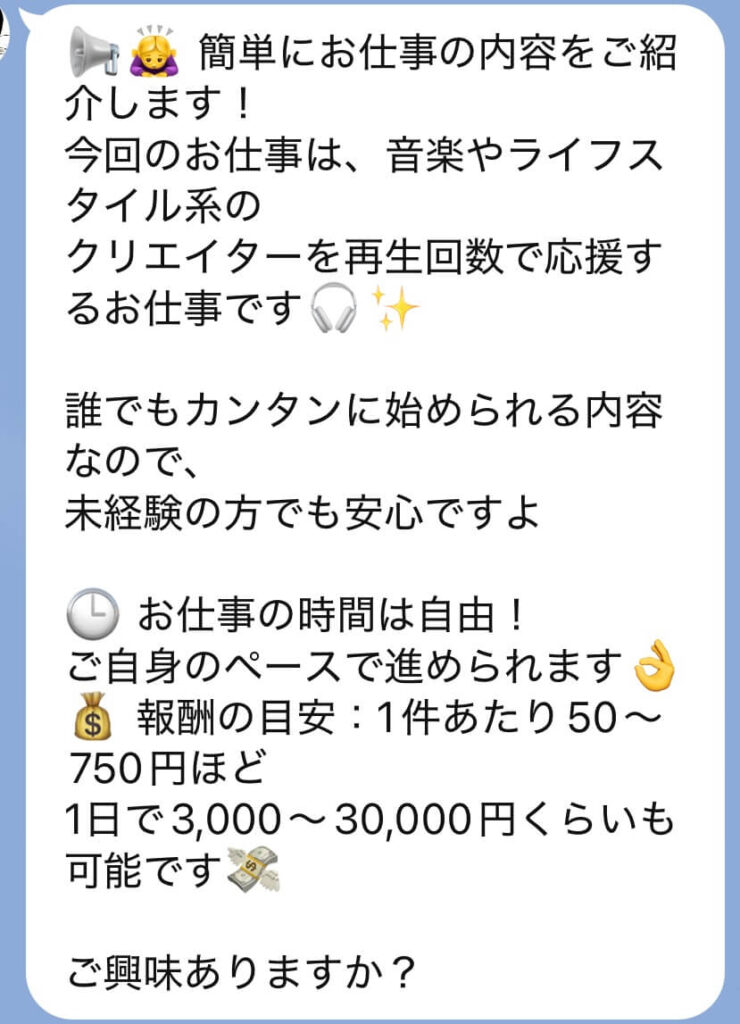 パターンはいくつもあるようですが、クリックしてLINE登録するとライフスタイル系のクリエイターの再生回数を応援する仕事だと説明があります。