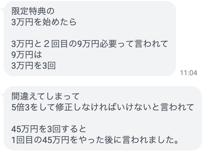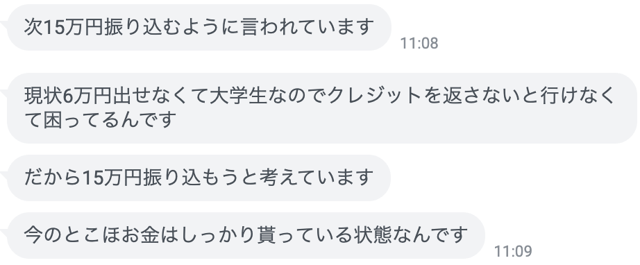 こちらの方はお金が戻ってきた例があったので信用して15万円を振り込もうとしていたので全力で阻止させていただきました💦