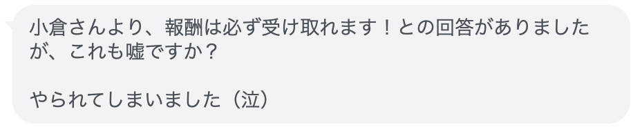 相談者からの情報で、総合報酬事務局の小倉から「報酬は必ず受け取れる」といったメッセージも届くようですが、信用してはいけません。