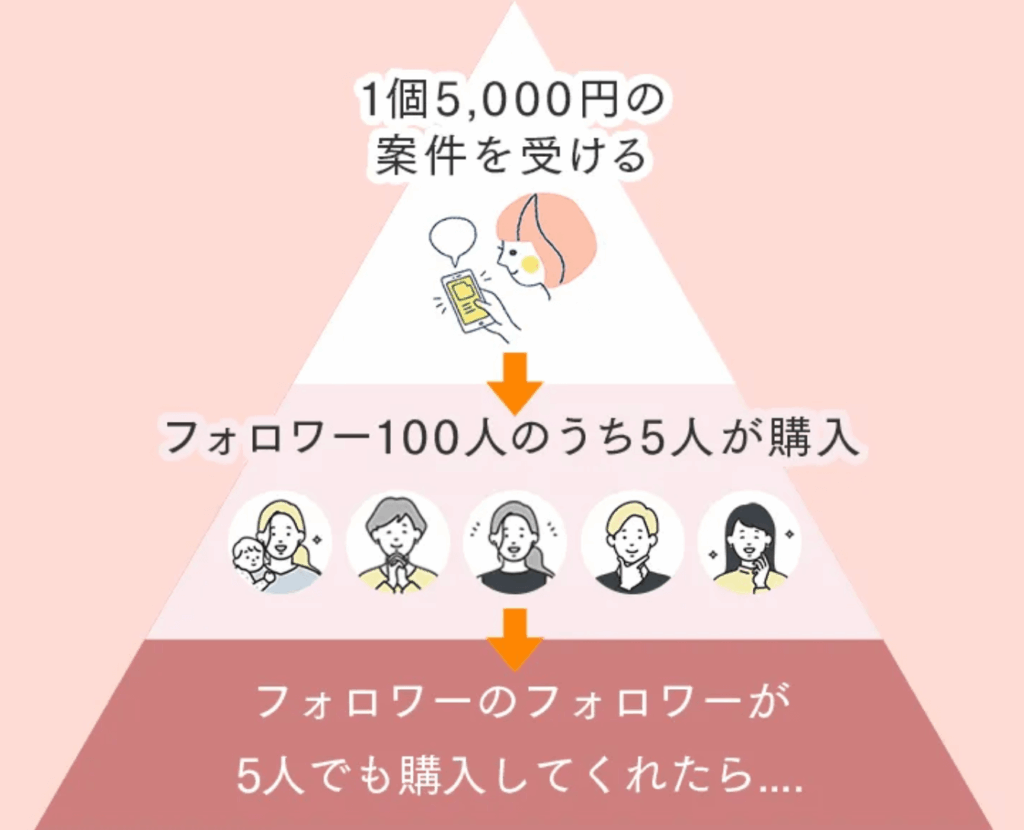 例として、1個5,000円の案件を受けた場合、フォロワー100人のうち5人が購入すると…