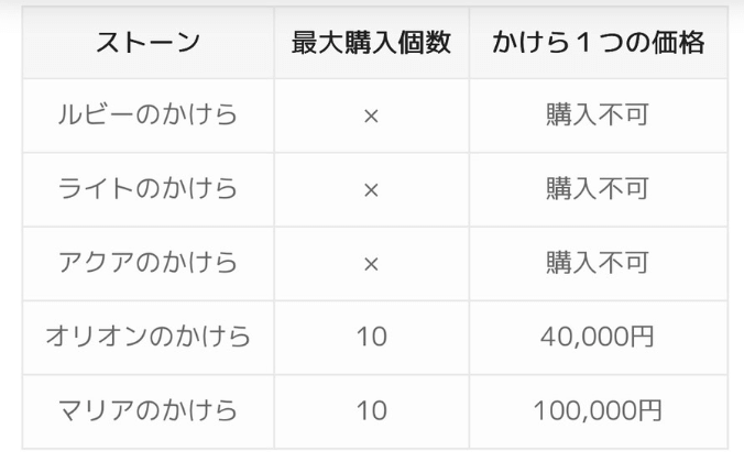 ストーンの種類は、ルビーストーン(30,000円分)、ライトストーン(100,000円分)、アクアストーン(250,000円分)、オリオンストーン(400,000円分)、マリアストーン(700,000円分)の5種類が存在していますが、上位2つのストーンは限られた男性会員しか得ることが出来ません。そのため、非常に貴重なストーンとなります。