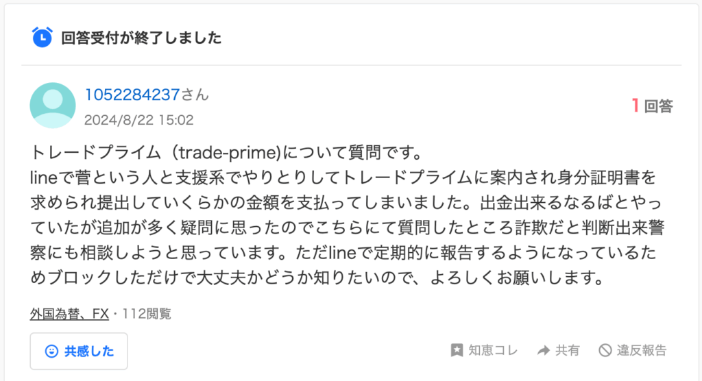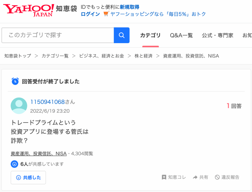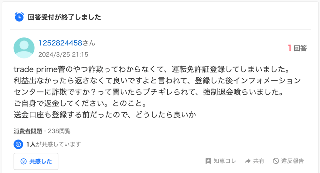 知恵袋だけでも、これだけのTradePrimeの情報と菅氏の悪質な手口が分かってきます。