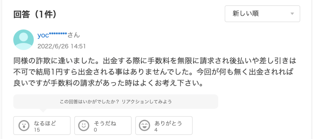 実際に詐欺に遭われている方もいて、手数料を無限に請求されて1円も出金できなかったようです。
