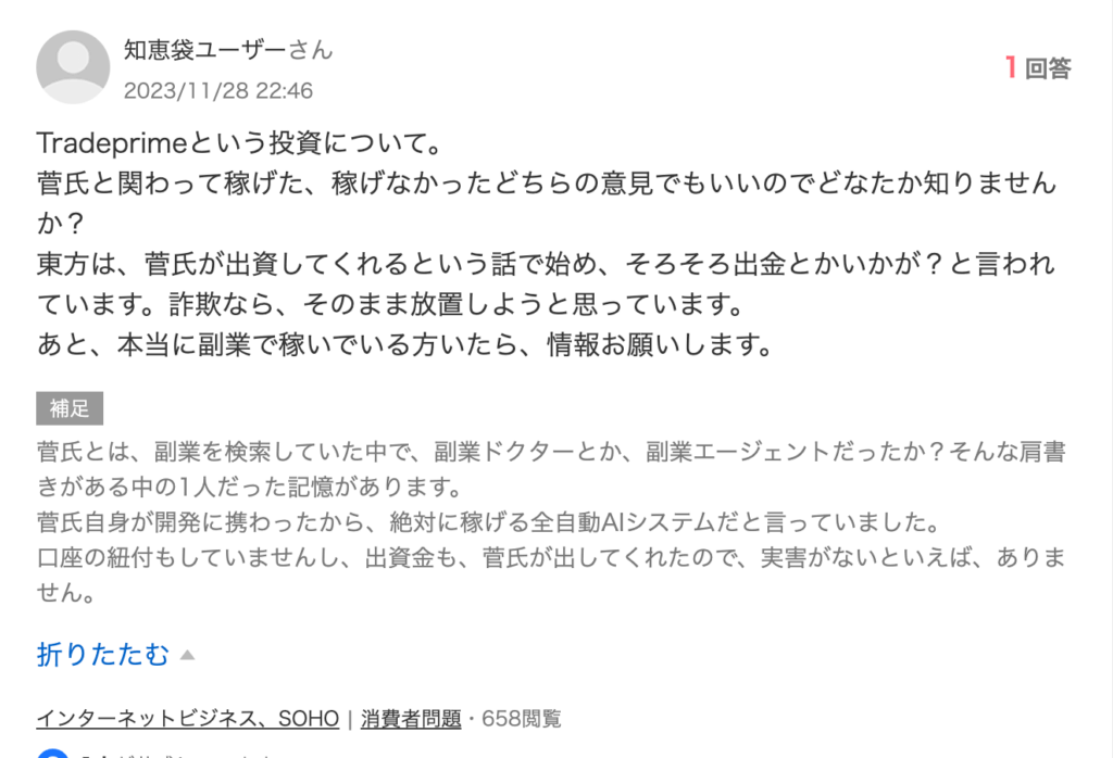 TradePrimeの口コミとして知恵袋にかなり多くの投稿がされていました。