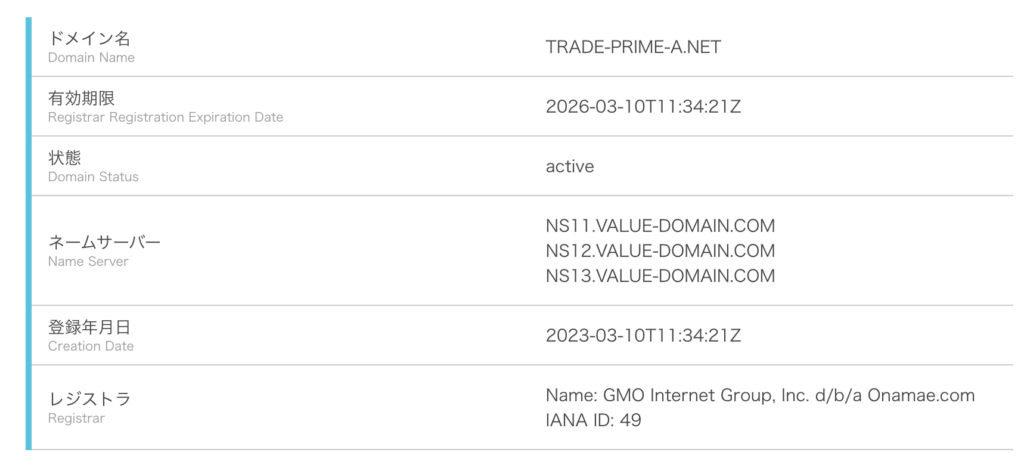 こちらは、TradePrimeのサイトのドメインになっていますが、調査してみたところ…