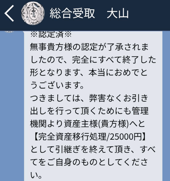 これは、支援金の名目で報酬を受け取るために25000円の支払いを求められているケースです。