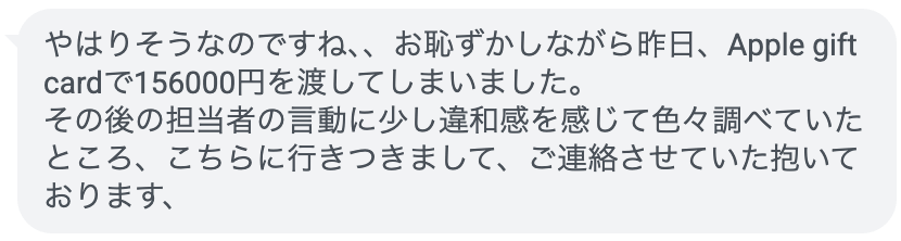 ただし、こちらの方は口座に残高がないと伝えたところ、アップルギフトカードでも対応しているのでそのコードをスクショで送って欲しいと言われたようです。