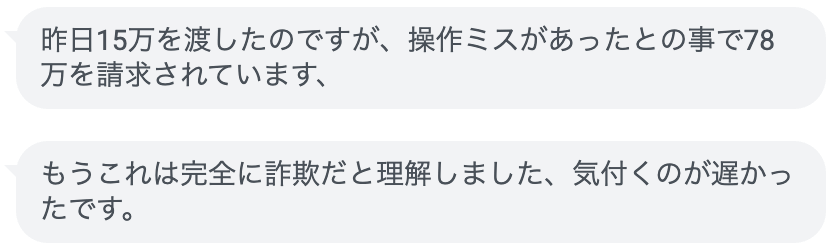 15万円を送金して、操作ミスがあったことでさらに78万円を請求されている例になります。