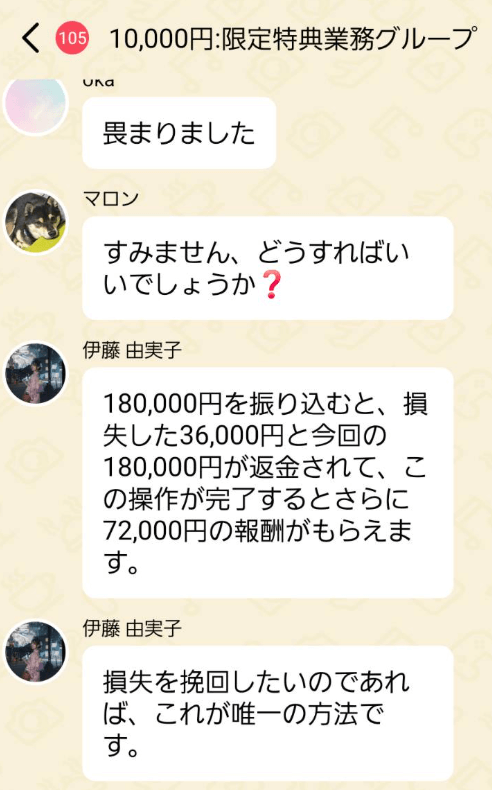 しばらくすると、金銭取引として仮想通貨もどきの振り込みをグループでやらされて、被害は拡大します。