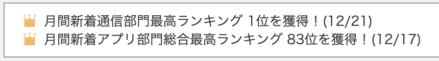 Android版では、月間新着通信部門最高ランキング1位、玄関新着アプリ部門総合最高ランキングでも83位を獲得しています。