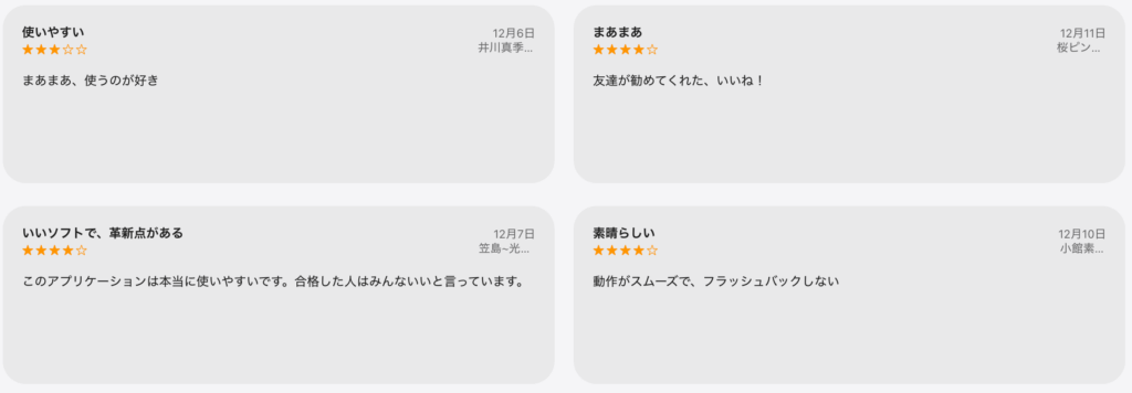 Android版にはレビューが確認が確認できなかったので、こちらはiPhone版のレビューになります。